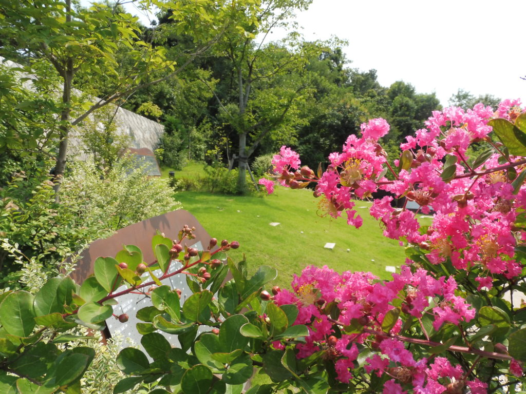 「桜の里・あさ陽の丘」に咲いたイッサイサルスベリ。中央に見えるのはシンボルツ...